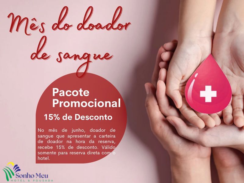 No mês de junho, doador de sangue que apresentar a carteira de doador na hora da reserva, recebe 15% de desconto. Válido somente para reserva direta com o hotel.